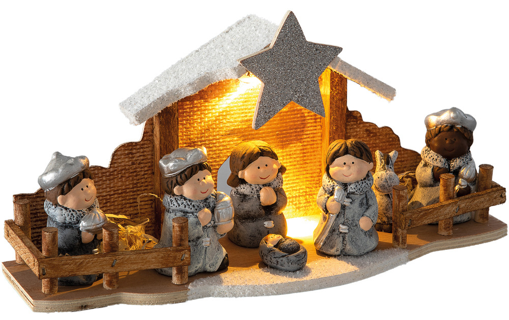 Vánoční dekorace • betlém • materiál: terakota • použití v interiéru • 1× LED • teplá bílá barva • napájení 2× LR44 baterie • rozměry 15,5 × 33 cm