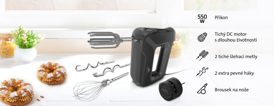 Ruční šlehač • příkon 550 W • 4 rychlosti • pulzní spínač • hněte a šlehá • brousek na nože • hmotnost 1,1 kg • délka napájecího kabelu 1,2 m