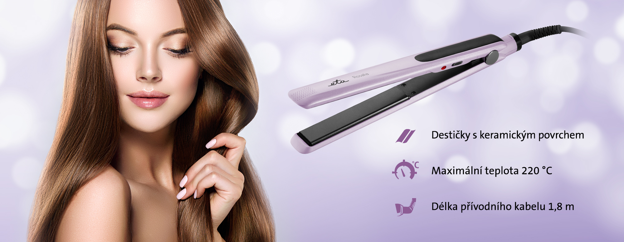 Fialové provedení žehličky ETA Rosalia dokonale koresponduje s něžností a elegancí, se kterou o vlasy pečuje. Odpružené destičky s keramickým povrchem k vlasům perfektně přilnou, a tak je narovnají rychle a účinně. Tomu napomůže i automatické udržovaní stálé provozní teploty, která dosahuje asi 220 °C. Díky PTC topným tělesům se na ni žehlička zahřeje během několika okamžiků.